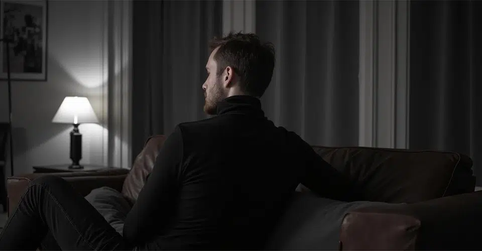 Homme assis sur un canapé convertible dans un salon tamisé avec lampe allumée en arrière plan
