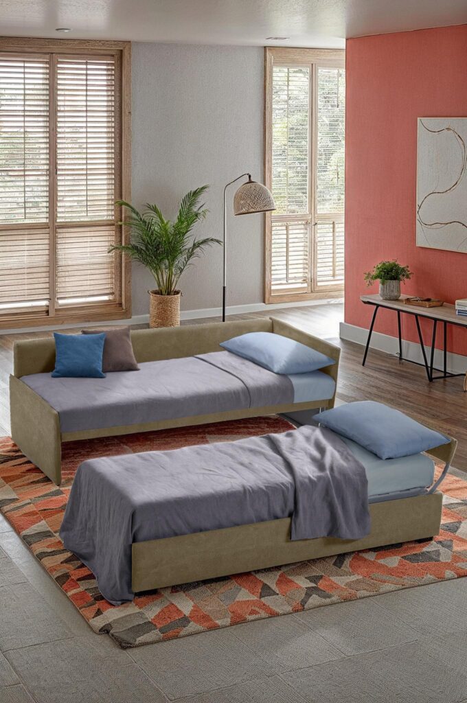 Grâce à des roues judicieusement placées, la banquette peut être tirée sans efforts et il vous suffit ensuite de lever une languette pour surélever le deuxième matelas.
