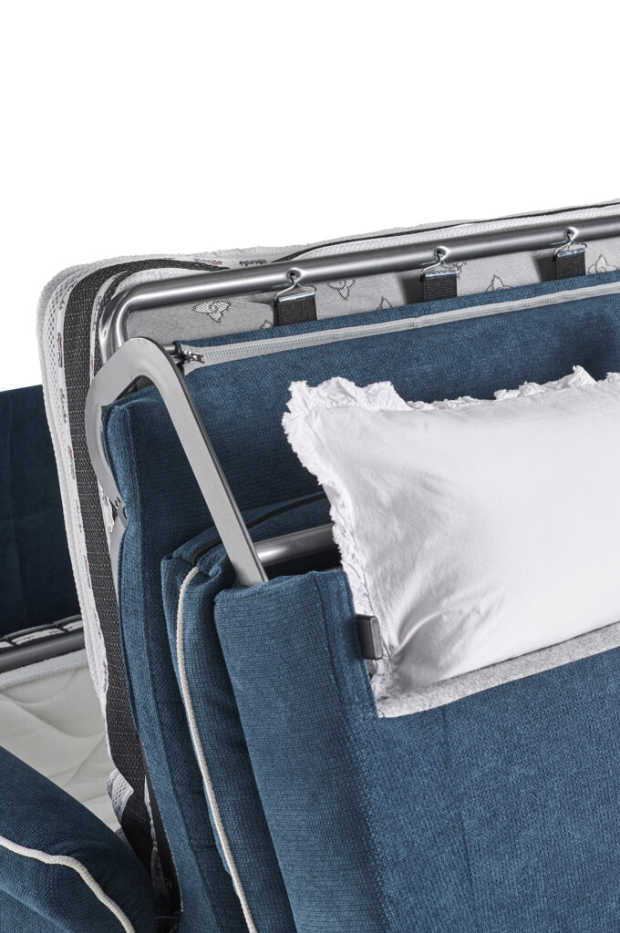Deux mécanismes sont disponibles et permettent une ouverture du canapé en une seule rotation en conservant les coussins d’assise et de dossier en place.